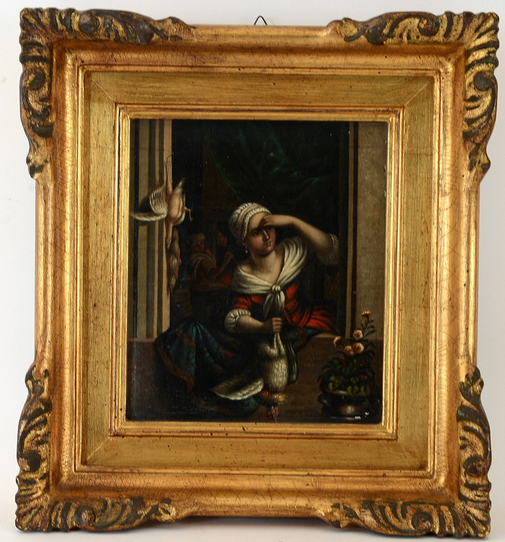 Scuola fiamminga sec. XIX "Riratto di donna alla finestra" olio su tela (cm 20,5x17) In cornice dorata