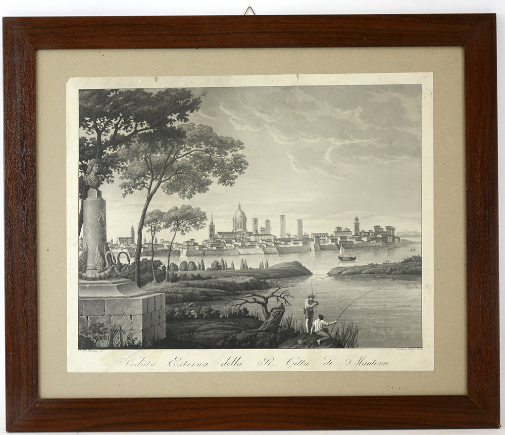 Acquatinta del sec. XIX raffigurante una veduta esterna della citt‡ di Mantova (cm 37x43) (difetti)
