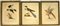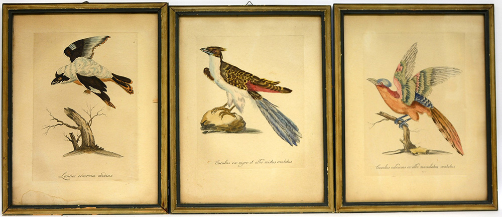 Gruppo di tre stampe a colori raffiguranti uccelli su rami, in cornici (difetti)
