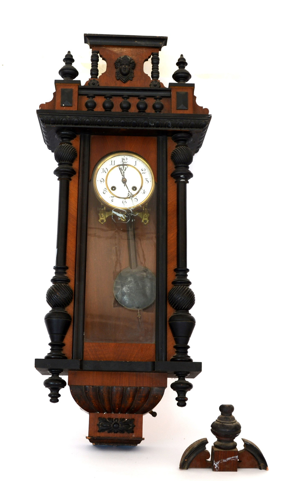 ANONIMO Pendola da parete con cassa in legno dolce, montanti ed elementi decorativi ebanizzati, quadrante in smalto con numeri arabi, meccanismo a carica settimanale con suoneria su gong delle ore e delle mezze, epoca inizio sec. XX (cm 40x107x18) (difetti e mancanze)