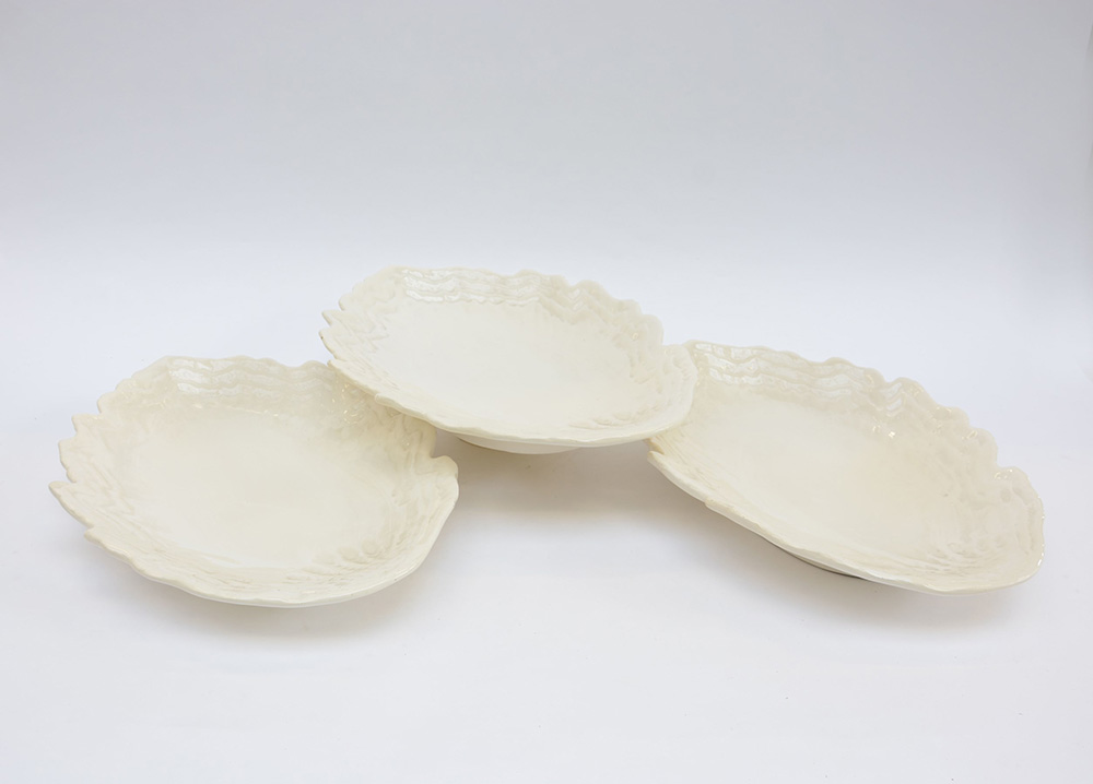 Manifattura italiana gruppo di tre vassoi a forma di foglia in ceramica bianca. Marcati sul fondo "Arcarosa Italy" (difetti)