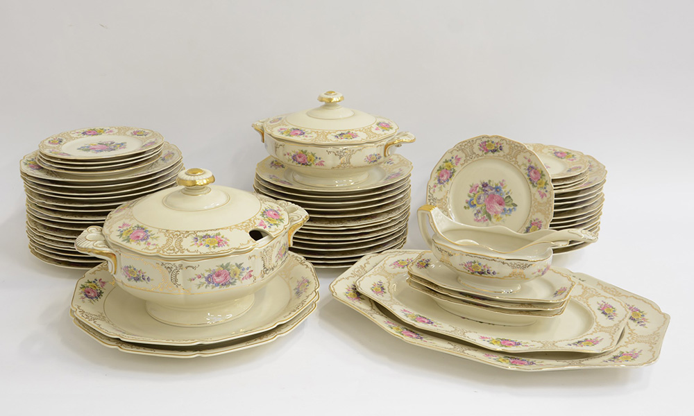 Manifattura di Heinrich. Servizio di piatti per sei persone in porcellana decorata a fiori e dorature. Composto da due zuppiere, una salsiera con cucchiaio, due vassoi ovali, due vassoi tondi, piatti fondi, piatti piani e numerosi piatti di ricambio (difetti)