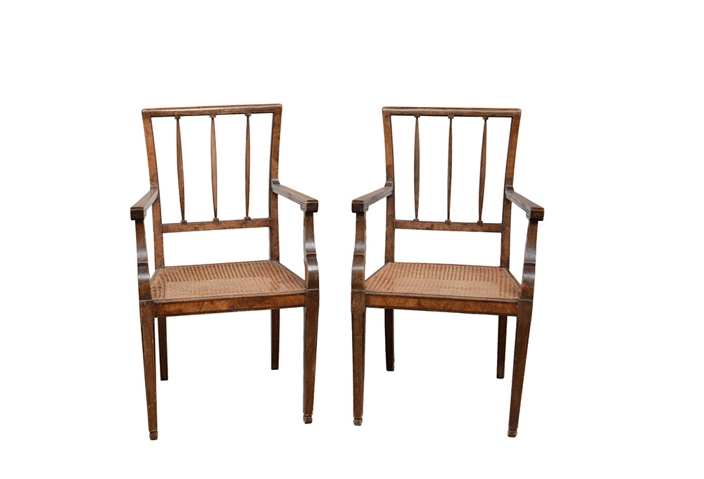 Coppia di poltrone con schienale a giorno e montanti torniti. Piedi rastremati, sedute in paglia di Vienna (difetti)