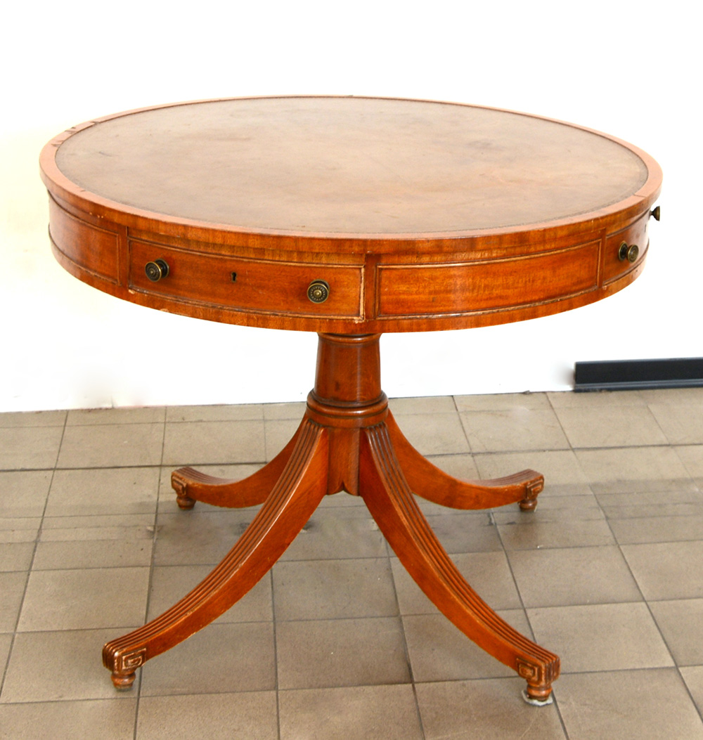 Tavolo tondo a tamburo con quattro cassetti nella fascia e piano ricoperto in pelle marrone, retto da colonna tornita su quattro gambe scanalate, sec. XX (cm 91x73x91) (difetti e mancanze)