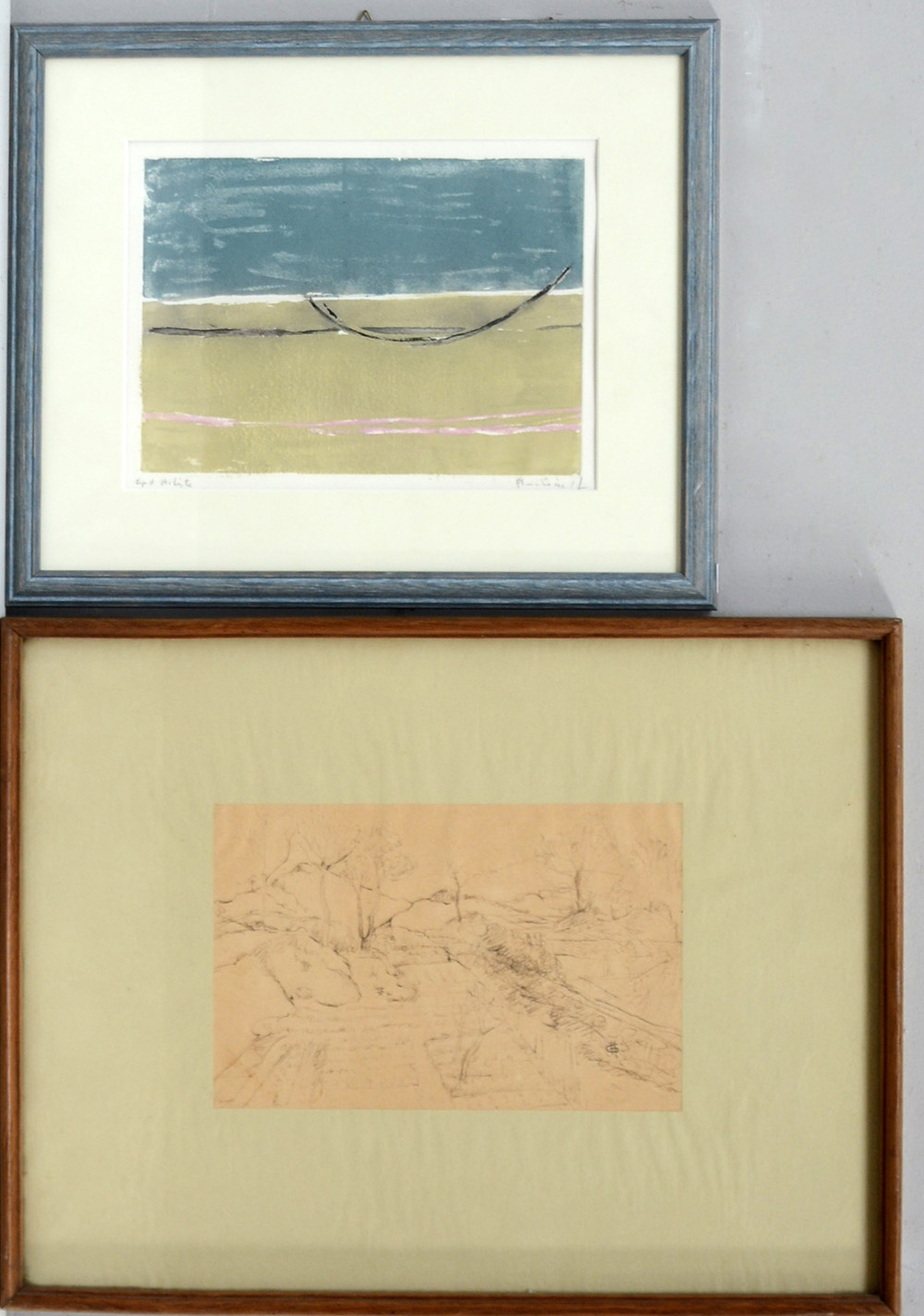 Lotto composto da un bozzetto a china raffigurante un paesaggio, siglato in basso a destra, e una prova d'artista di Bernadette Planchenault, dimensioni differenti, in cornici