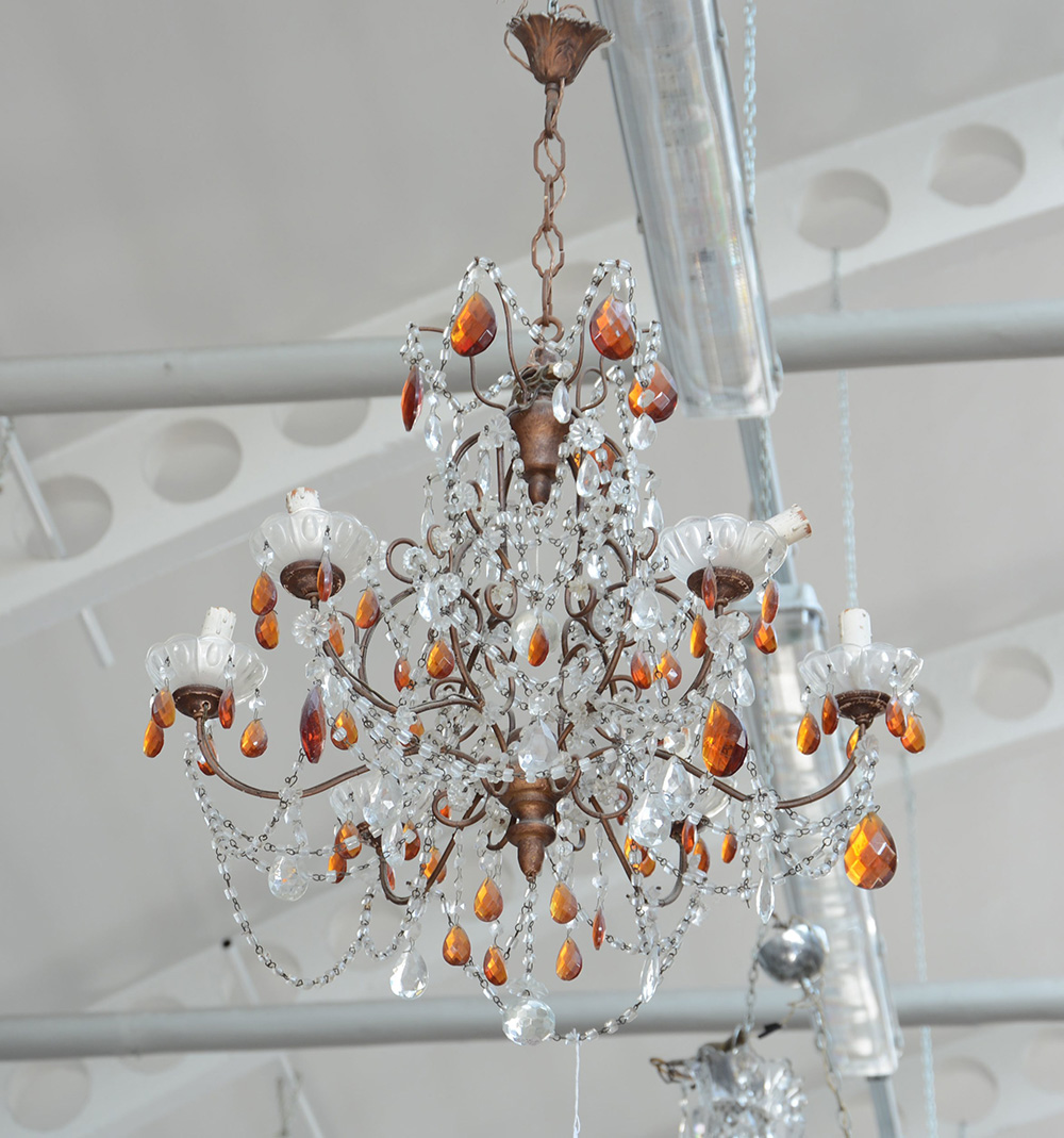 Lampadarietto a sei luci con gocce policrome decorato a perlinature (difetti)