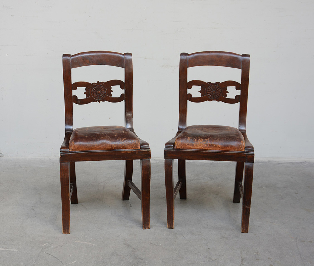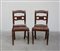Coppia di sedie in noce con schienale a giorno e cartelle sagomate, gambe mosse. Sec. XIX (difetti)