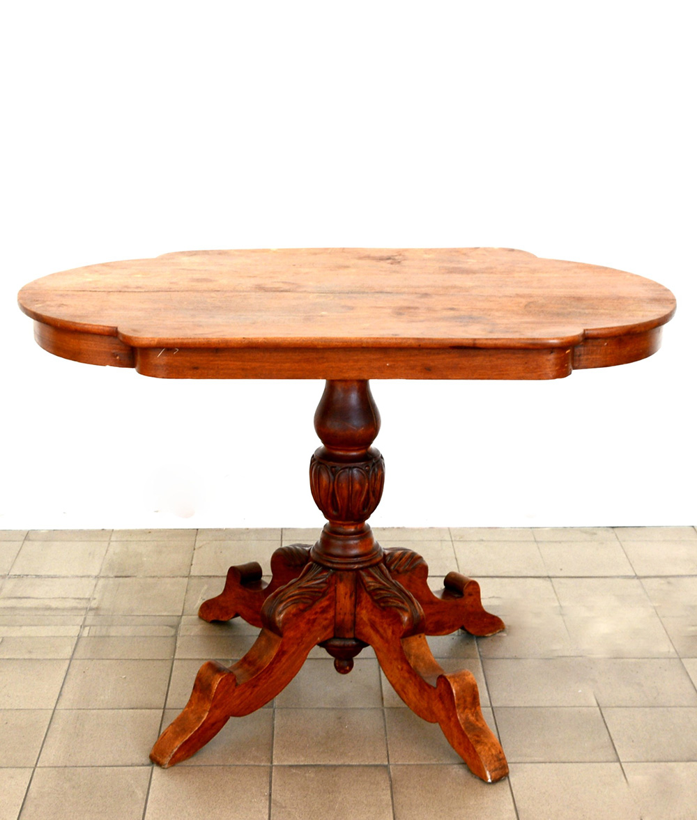 Tavolo con piano a 'biscotto', sostegno a quattro gambe mosse e intagliate con montante a colonna tornita (cm 112x77x65) (difetti)