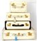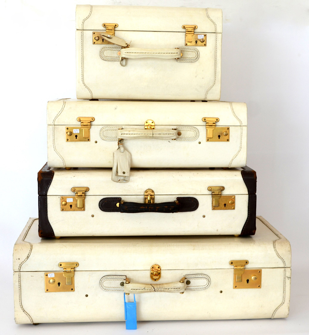 Valigeria Franzi, set di quattro valigie da viaggio color avorio con cernicere in metallo dorato, di cui una con rinforzi in cuoio (difetti)