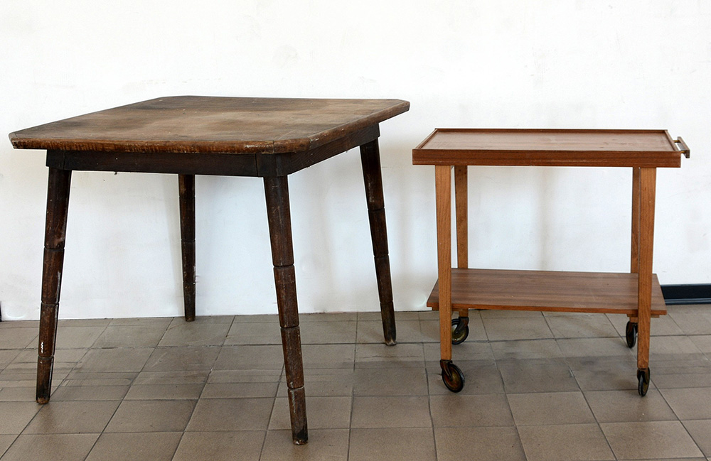 Lotto composto da un tavolino rustico quadrato (cm 81x72x81) e un carrello portavivande (difetti)