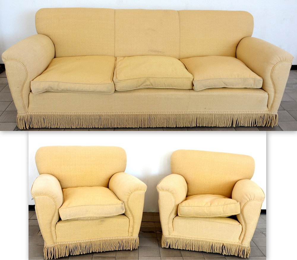 Fornitura da salotto composta da un divano a tre posti e due poltrone rivestite in tessuto giallo frangiato (difetti)