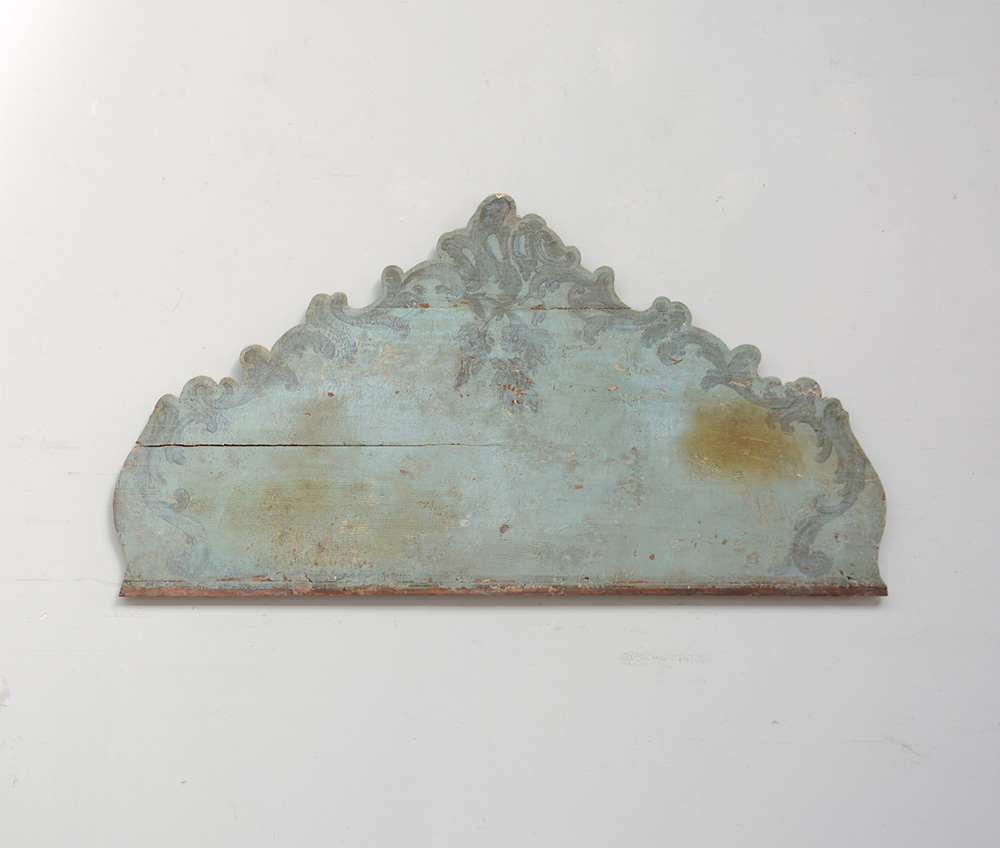 Testata da letto ad una piazza in legno laccato di forma sagomata decorata a volute (difetti)