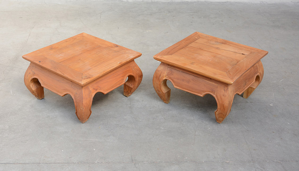Arte orientale. Coppia di sgabelli in legno con gambe e fasce sagoamte (difetti)