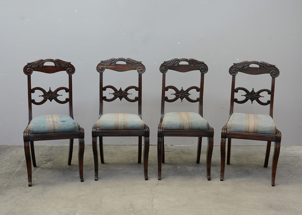 Gruppo di quattro sedie in noce con schienale a giorno e cartella intagliata. Gambe sagomate, sec. XIX