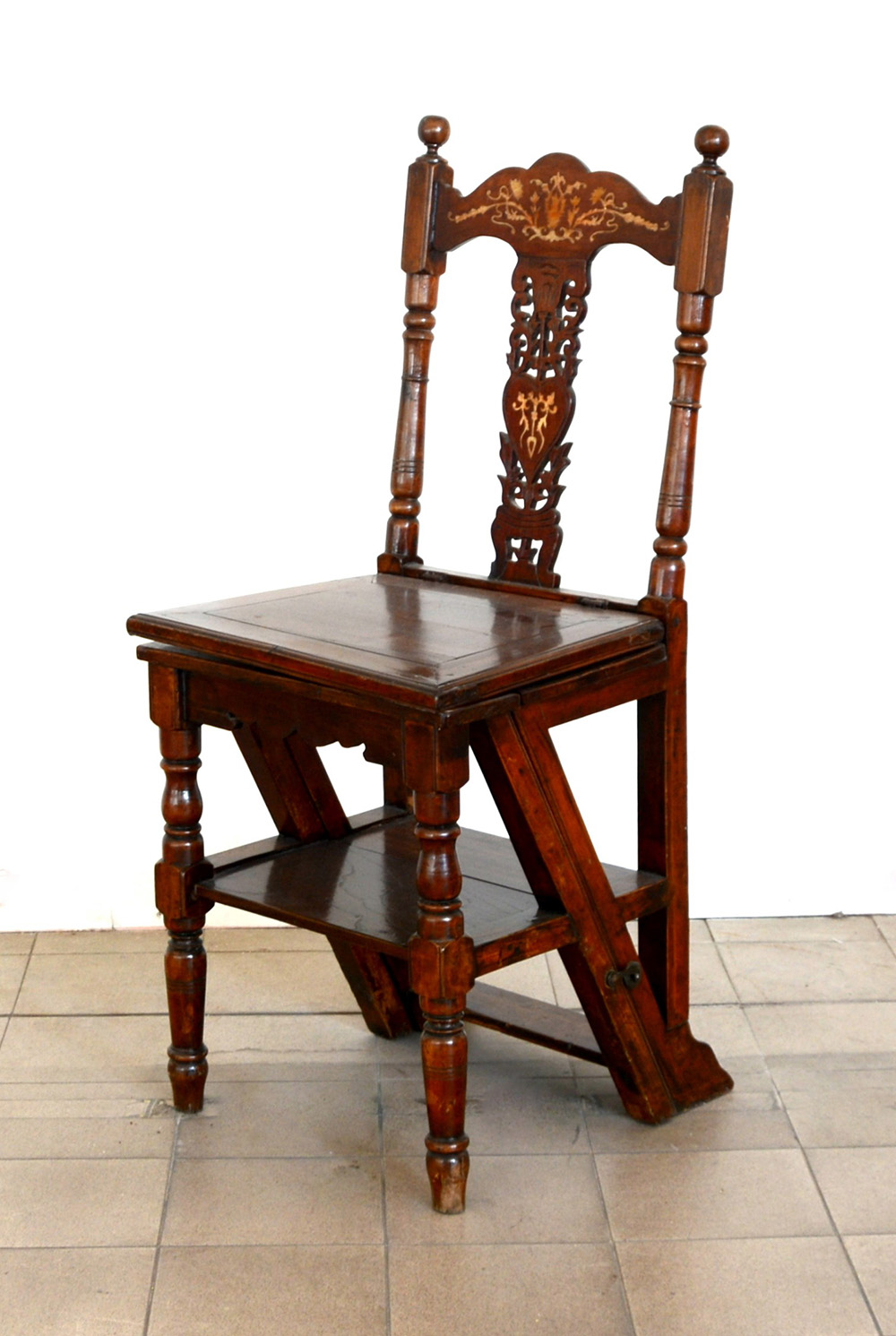 Scaletta da biblioteca a tre pioli richiudibile a sedia con schienale a giorno ed intarsi in osso (difetti)