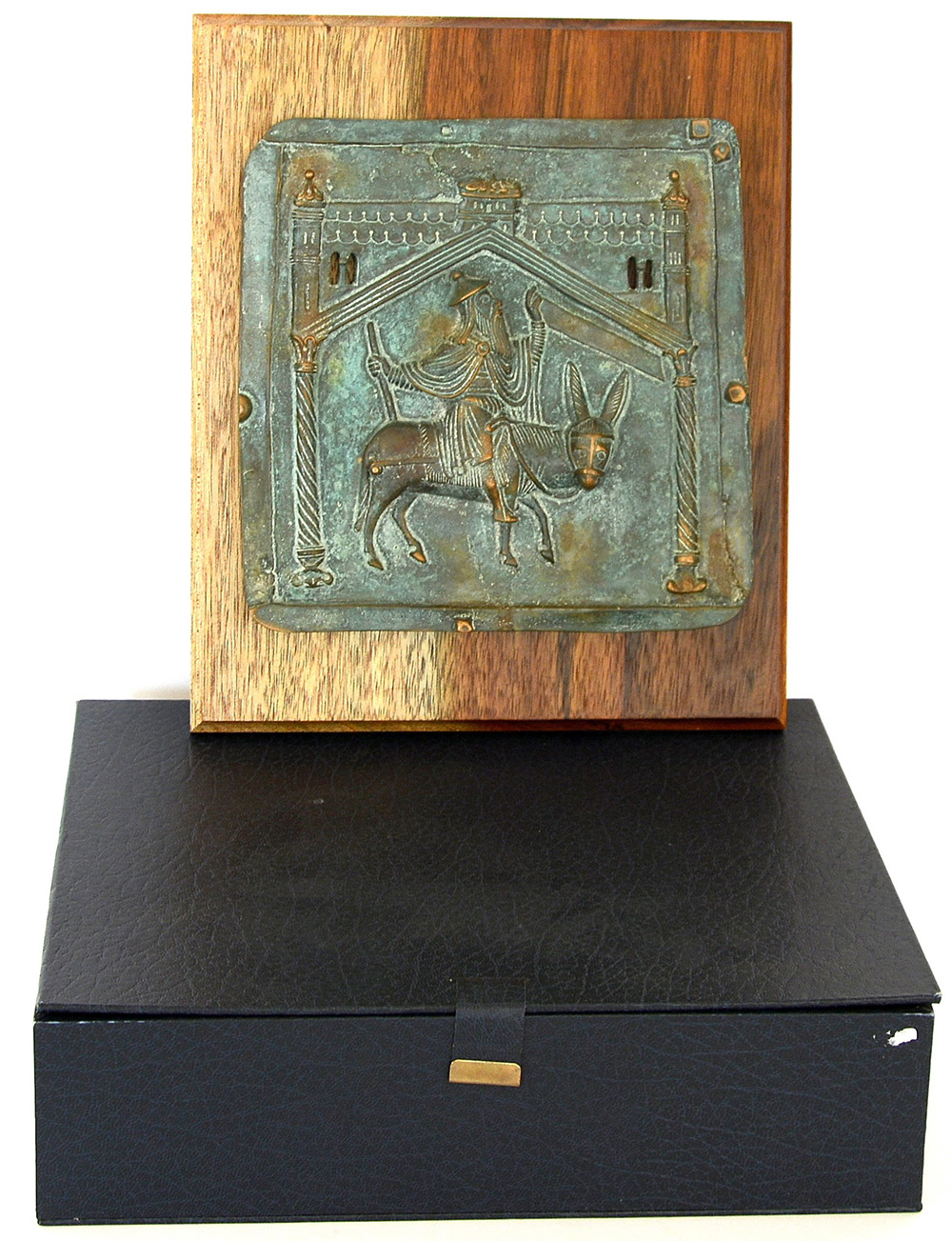 Riproduzione in bronzo di una formella del portale del duomo di San Zeno a Verona, applicata su pannello in legno, Edizioni d'Arte Fidia Gallery, in custodia originale (pannello cm 20x24)
