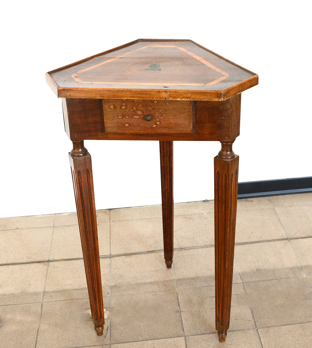 Tavolino d'angolo tripode in legno dolce con piano ad angoli smussati, filettato, con cassetto e gambe rastemate (cm 49x73x41) (difetti)