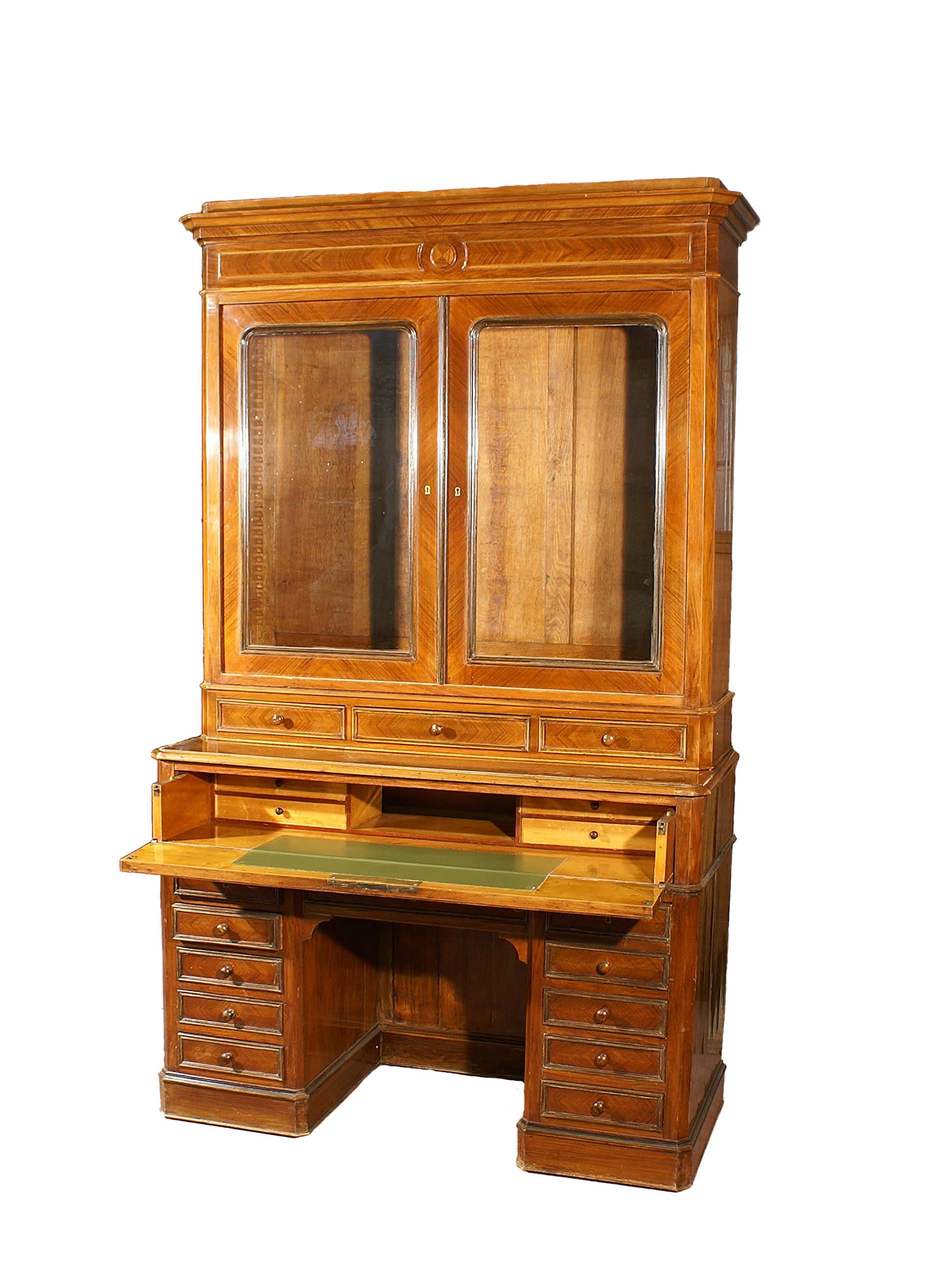 Mobile a due corpi in noce, porta superiore con due ante a vetro e tre cassetti sottostanti, parte inferiore con cassetto celante scrittoio ed ulteriori dieci cassetti sottostanti, Francia, periodo Luigi Filippo, cm. 230x147x61.