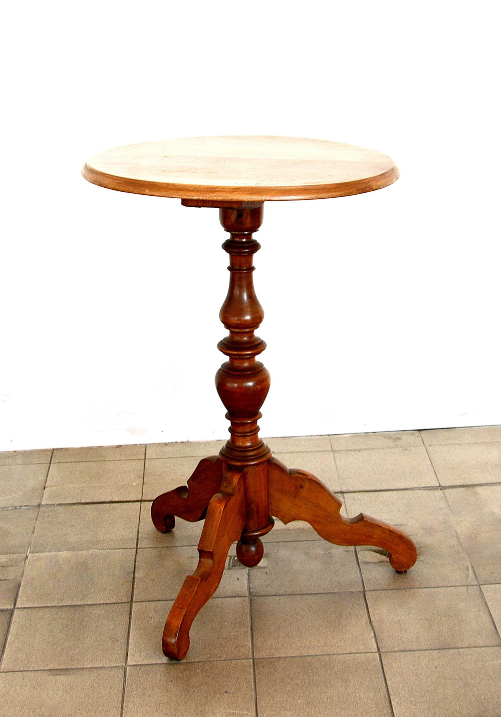Tavolino servant con piano tondo su base tripode e colonna tornita (cm 50x75x50) (difetti)