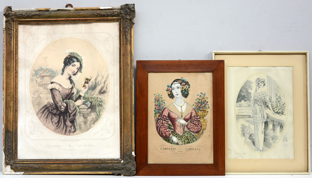Lotto composto da tre incisioni raffiguranti dame, di epoche e dimensioni differenti, in cornici (difetti)
