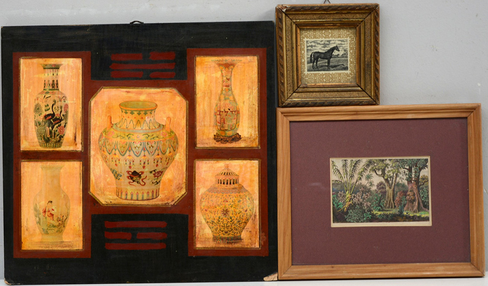 Lotto composto da due incisioni in cornici raffiguranti un cavallo e uno scorcio di giungla, e una composizione con vasi orientali, misure differenti (difetti)