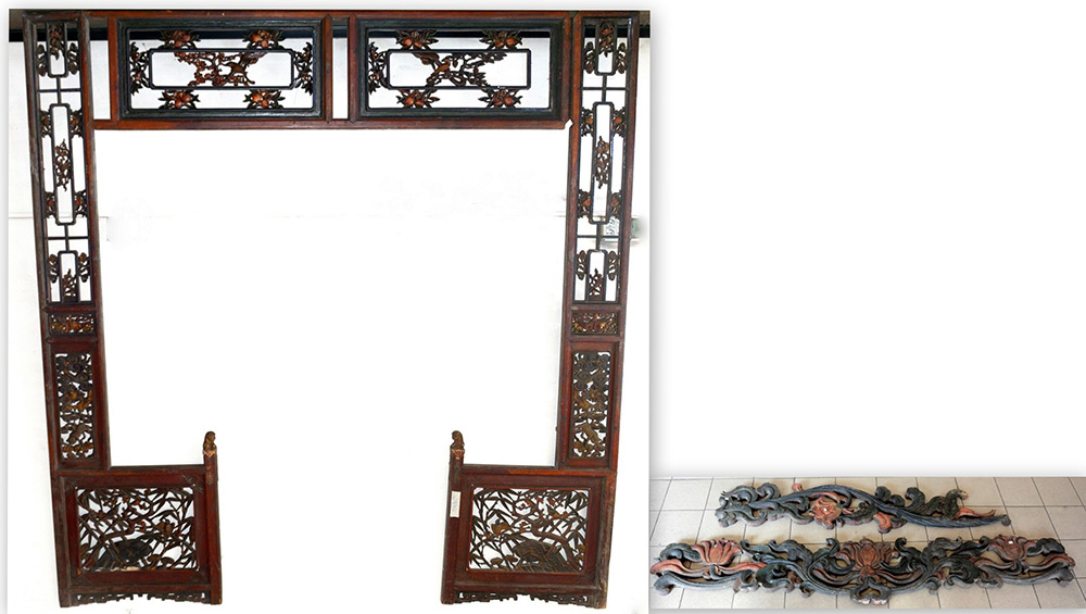 Due grandi pannelli divisori in legno intagliato con volatili e motivi geometrici e un fregio intagliato con simboli di buon auspicio. Cina, inzio sec. XX (cm 330x90; cm 132x173) (difetti e rotture)