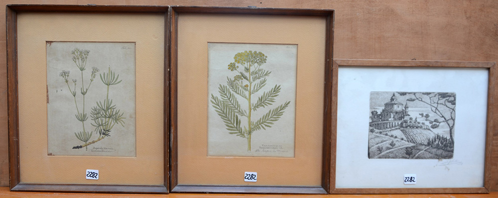 Lotto composto da due stampe a colori raffiguranti piante e un'acquaforte raffigurante paesaggio, in cornici
