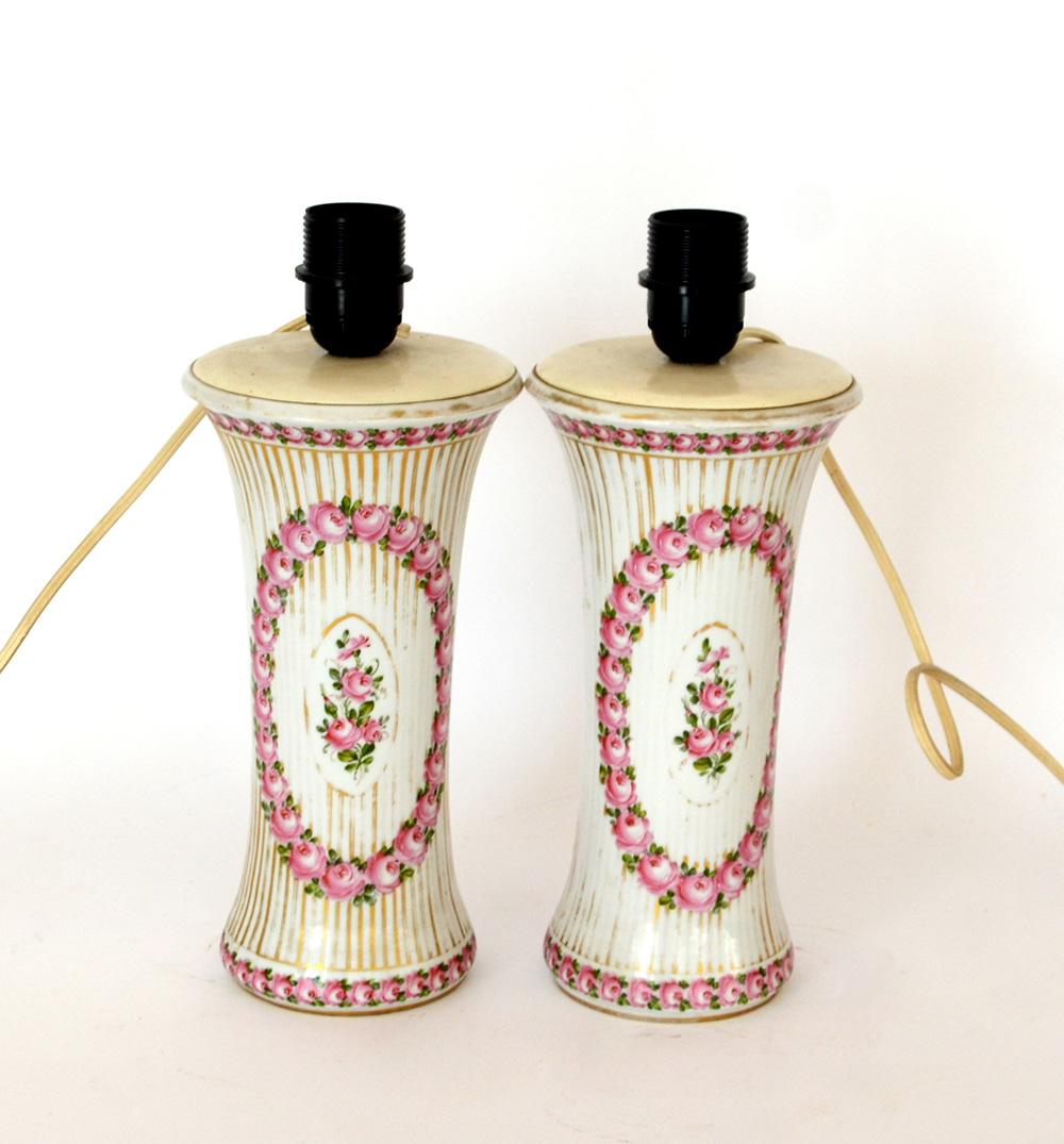 Coppia di vasi cilindrici in porcellana decorati con rose e filettature dorate, montati a luce elettrica (h vasi cm 26) (difetti)