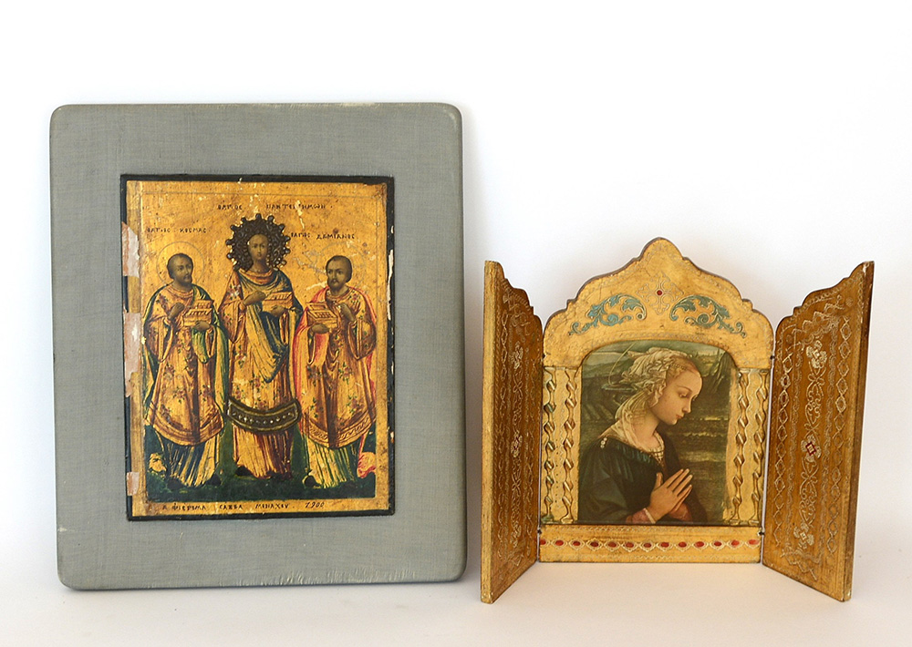 Lotto composto da un'icona montata su pannello e un'edicola votiva contenete una stampa (icona cm 29x23) (difetti)