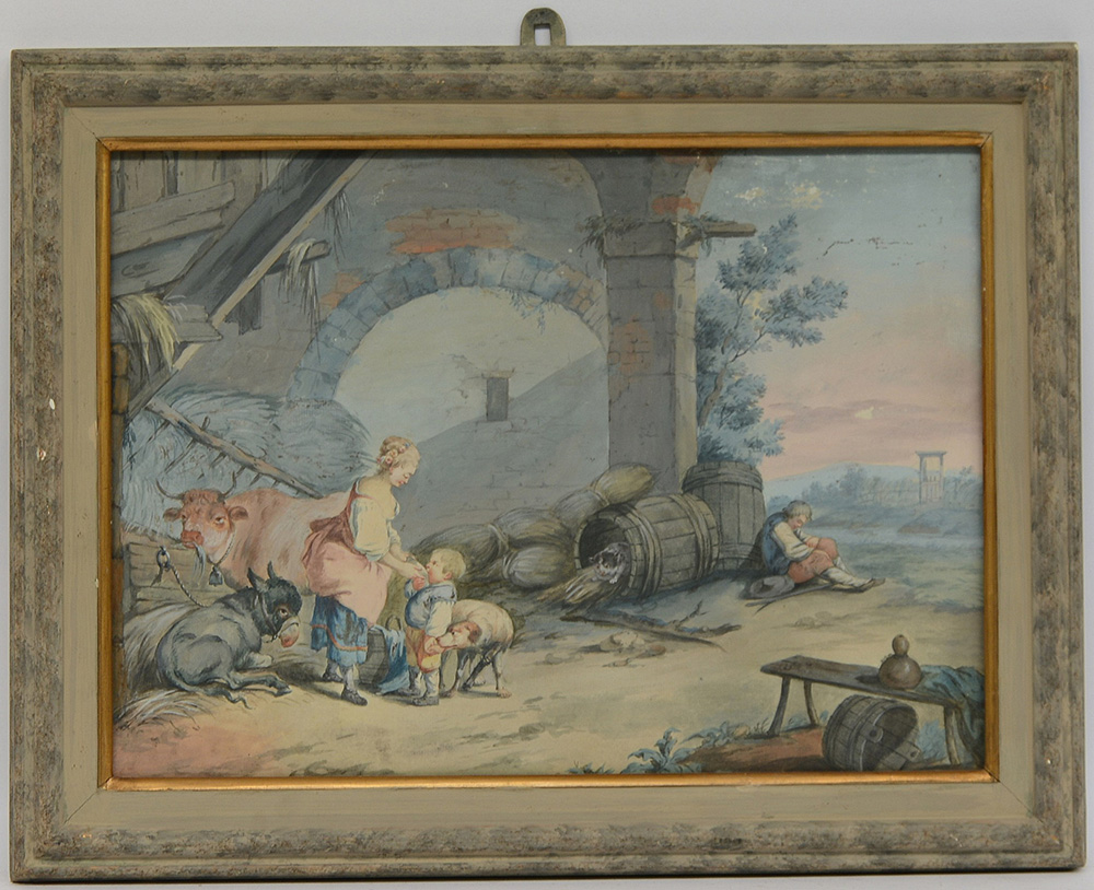 Scuola del secolo XVIII - "Scena agreste", gouache su carta (cm 34x47) in cornice antica (difetti)