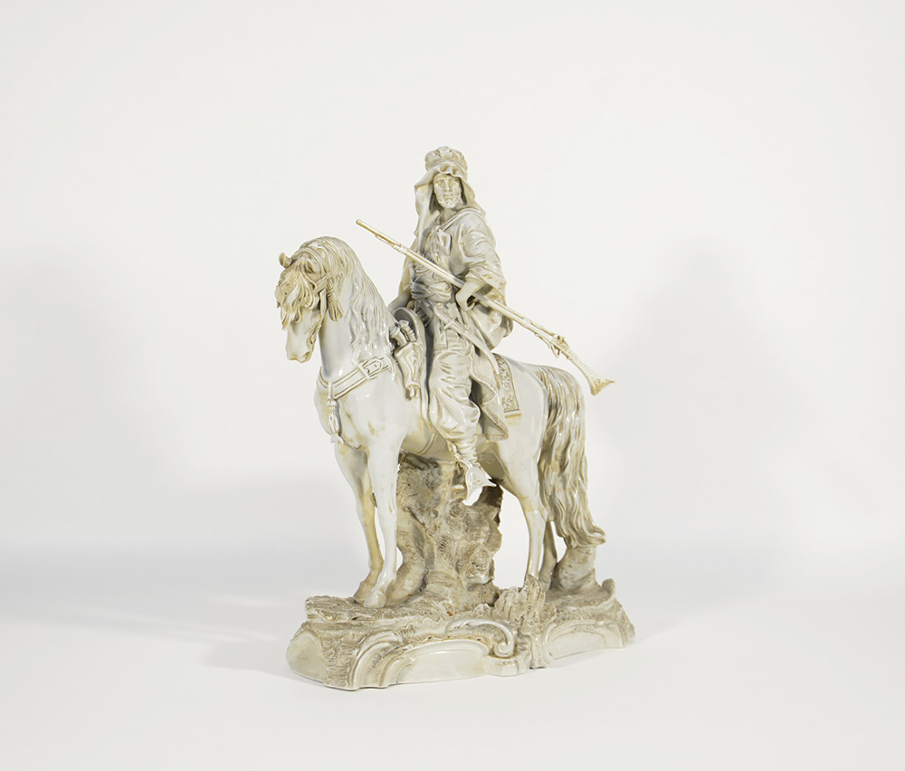 Manifattura italiana. Gruppo in ceramica bianca raffigurante soldato arabo a cavallo, base sagomata (difetti)