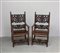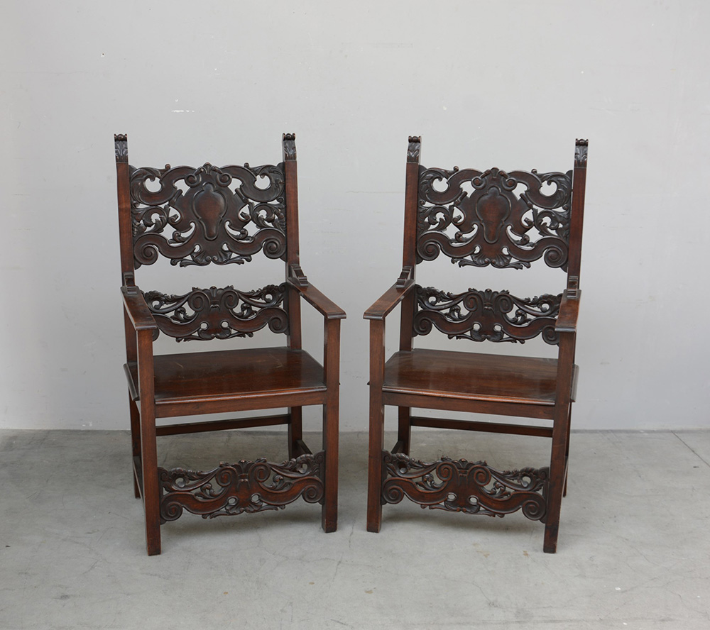 Coppia di poltrone "rinascimentali" con cartelle intagliate a motivi vegetali e volute. Braccioli e gambe dritte