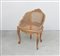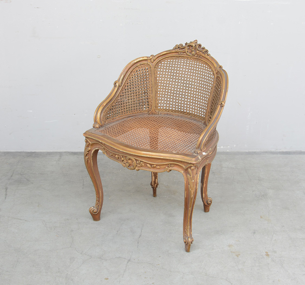 Poltroncina a pozzetto in legno dorato intagliato a motivi floreali, schienale, braccioli e gambe mosse. Seduta e schienale in paglia di Vienna (difetti)