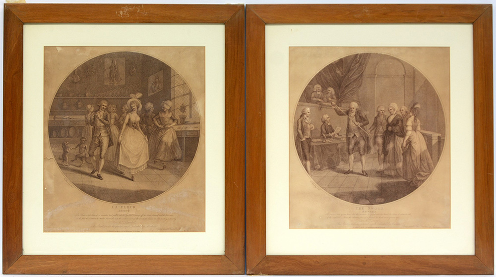 Bartolozzi Lotto di due antiche incisioni inglesi "La Fleur, Amiens" e "The Sword, Rennes" da W. Harding, in cornici (difetti)