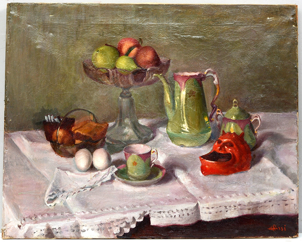 Rossi G. "La colazione", olio su tela (cm 60x74) firmato in basso a destra e iscritto al verso (difetti)
