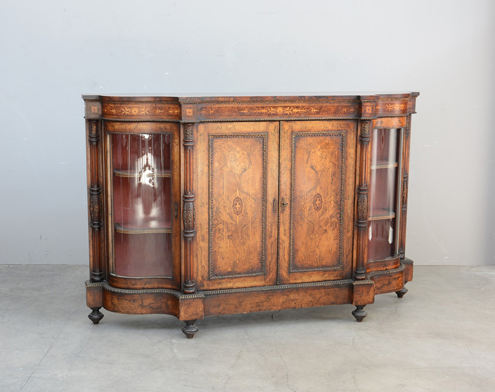 Credenza di forma sagomata lastronata in radica e intarsiata a motivi vegetali, fiori e volute a due ante riquadrate sul fronte e due ante a vetri curve ai lati. Montanti a mezze colonne scanalate. Piedi torniti sec. XIX (cm 180x116x43)