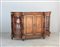 Credenza di forma sagomata lastronata in radica e intarsiata a motivi...