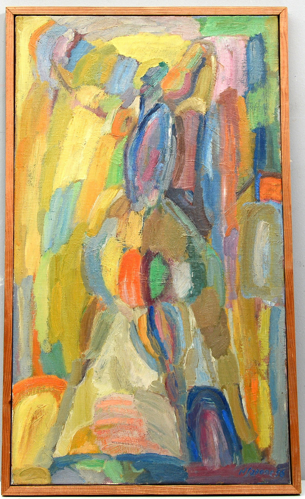 Sapone N. "Composizione", olio su tela (cm 70x40) firmato e datato 1956 in basso a destra, timbro di galleria al verso, in cornice