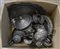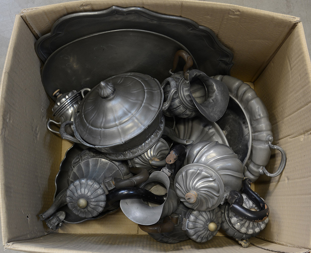 Cartone contenente numerosi oggetti per la tavola in peltro (difetti)