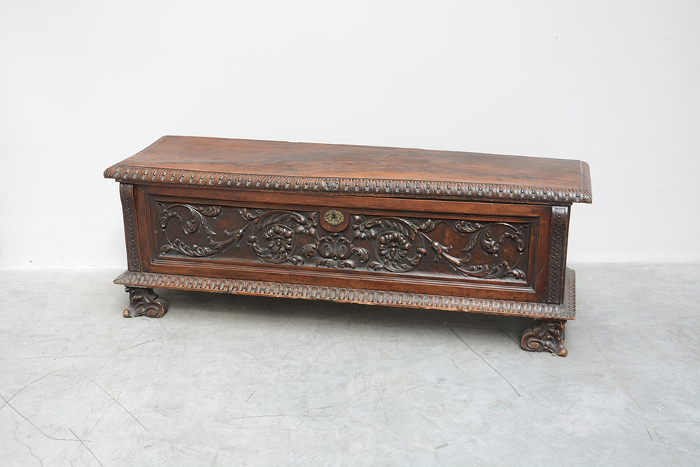Antica cassapanca in noce con fronte riccamente intagliato a motivi vegetali,...