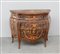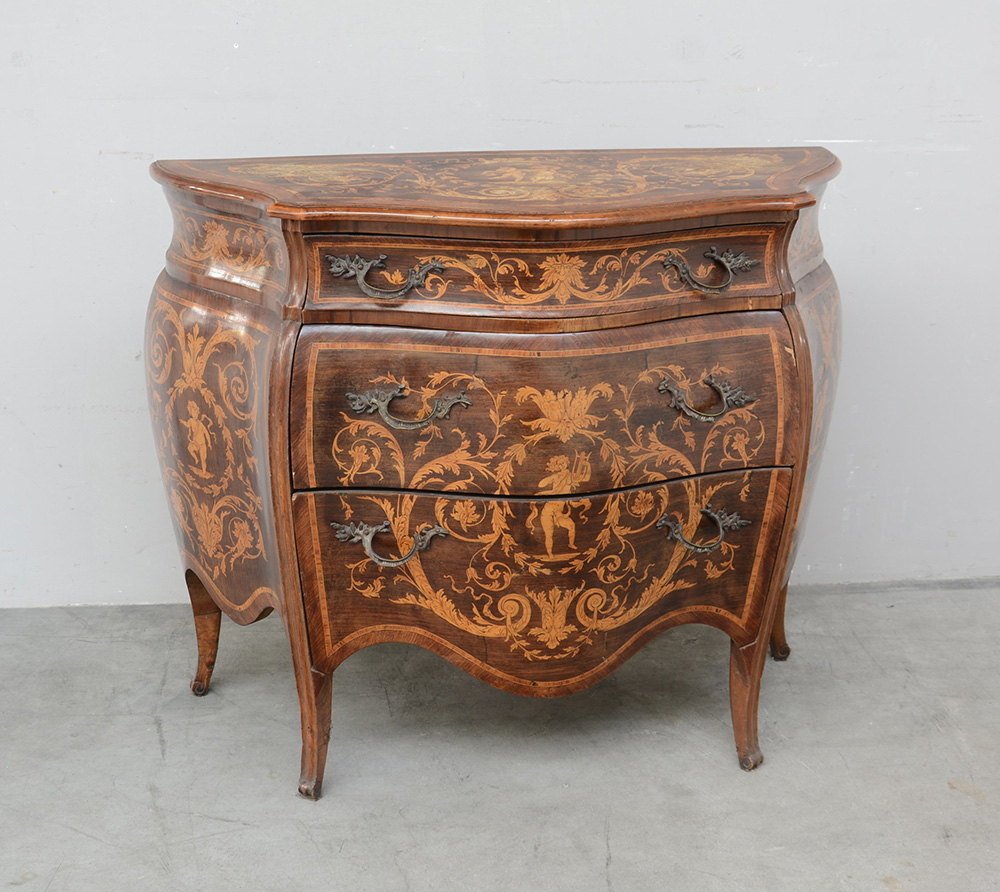ComÚ di forma mossa intarsiato e filettato a motivi vegetali, volute, putti e nastri; ad un cassetto sottopiano e due grandi cassetti sul fronte. Piedi mossi (cm 110x90x50) (difetti)