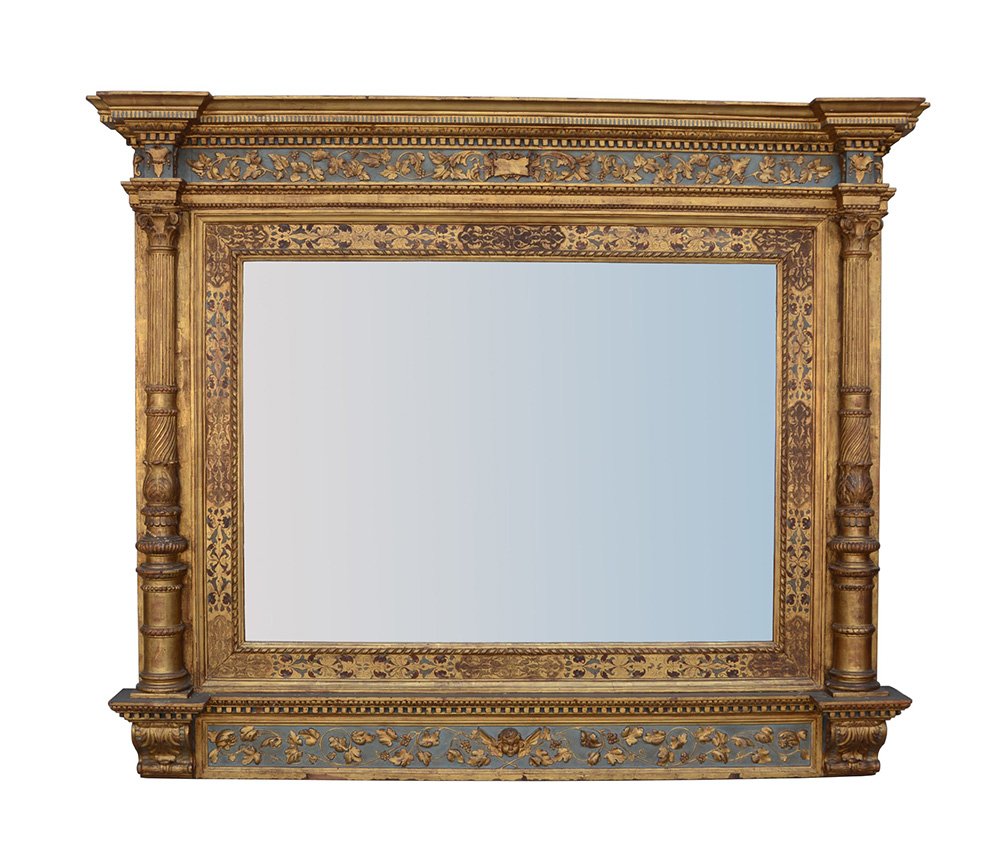 Grande caminiera in legno intagliato e scolpito, dorato e laccato, con montanti laterali a colonna retti da mensole, motivi decorativi fitomorfi in bassorilievo alle estremit‡ ed incisi e dipinti lungo la cornice centrale. Epoca secolo XIX (cm 183x151x18) (difetti e restauri)