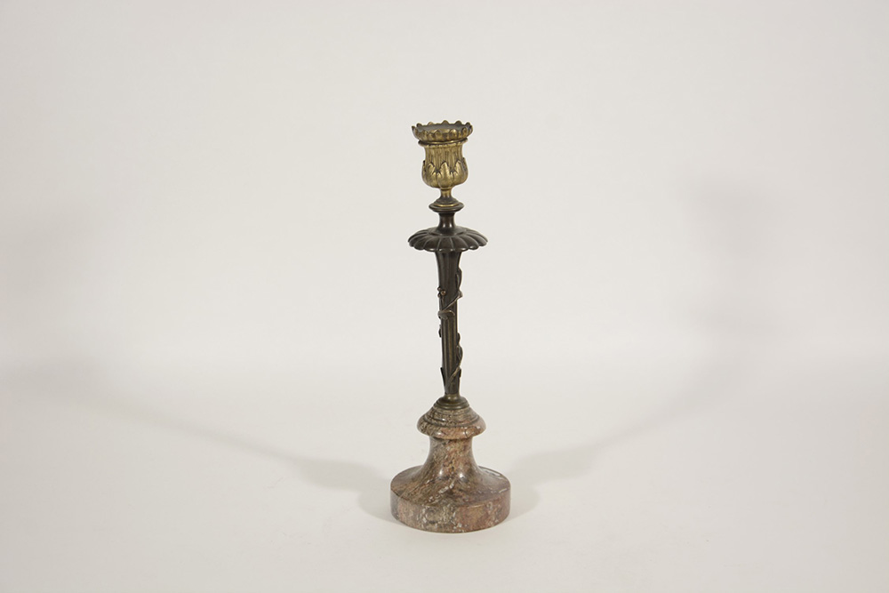 Candeliere in metallo brunito e dorato con basamento in mermo (h cm 31) (difetti)