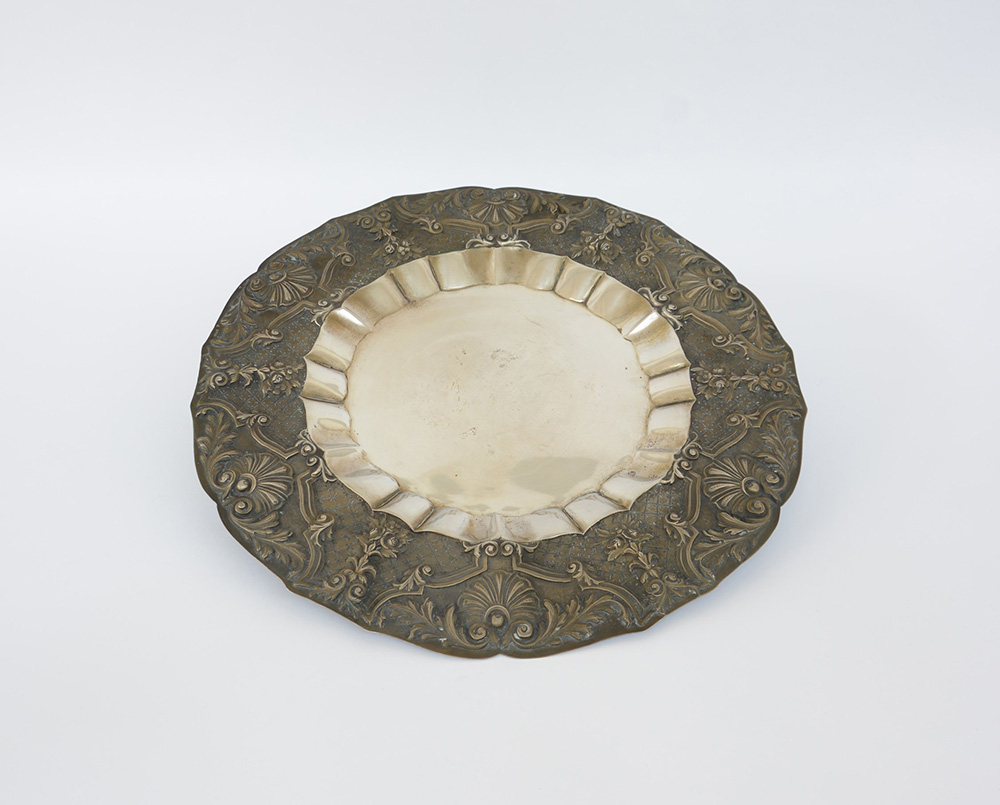 Vassoio in argento sbalzato con tesa decorata da foglie, fiori e conchiglie,...
