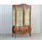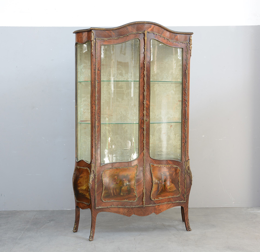 Vetrina di forma mossa lastronata in palissandro a due ante a vetri sul fronte decorate nella fascia con scene galanti e paesaggi, profili e fregi in ottone, piedi sagomati. Francia fine sec. XIX (cm 114x195x44)