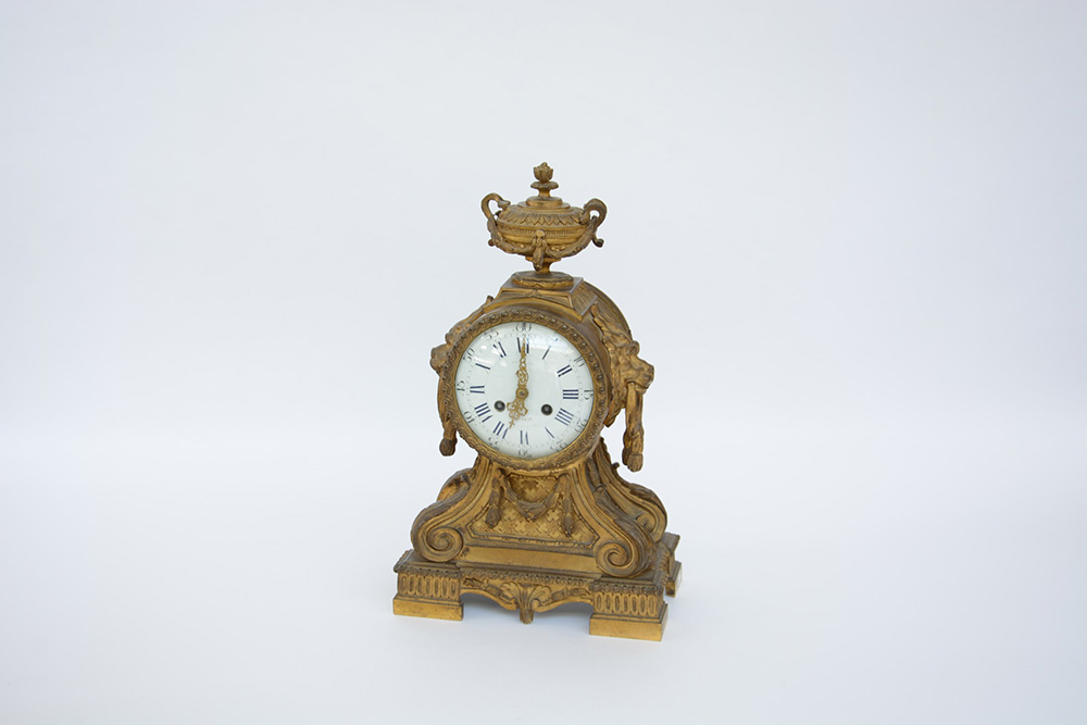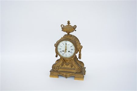 Pendola da camino in metallo dorato con basamento architettonico, parte superiore decorata con teste leonine ed urna festonata. Quadrante in metallo smaltato bianco con numeri arabi e romani, carica settimanale delle ore e delle mezze con suoneria su campanello. Francia, fine secolo XIX (h cm 41) (difetti e chiave allegata non pertinente)