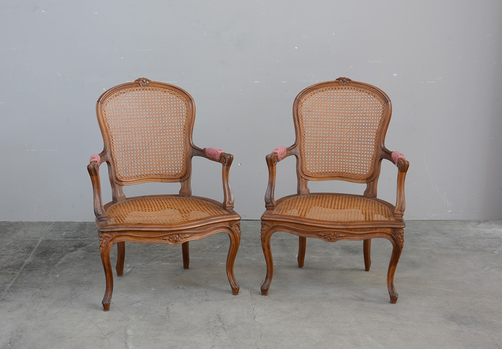 Coppia di poltroncine con schienale, braccioli e montanti sagomati. Gambe mosse, seduta e schianle in paglia di Vienna.