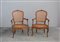 Coppia di poltroncine con schienale, braccioli e montanti sagomati. Gambe...