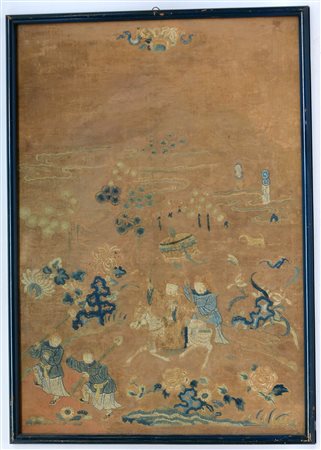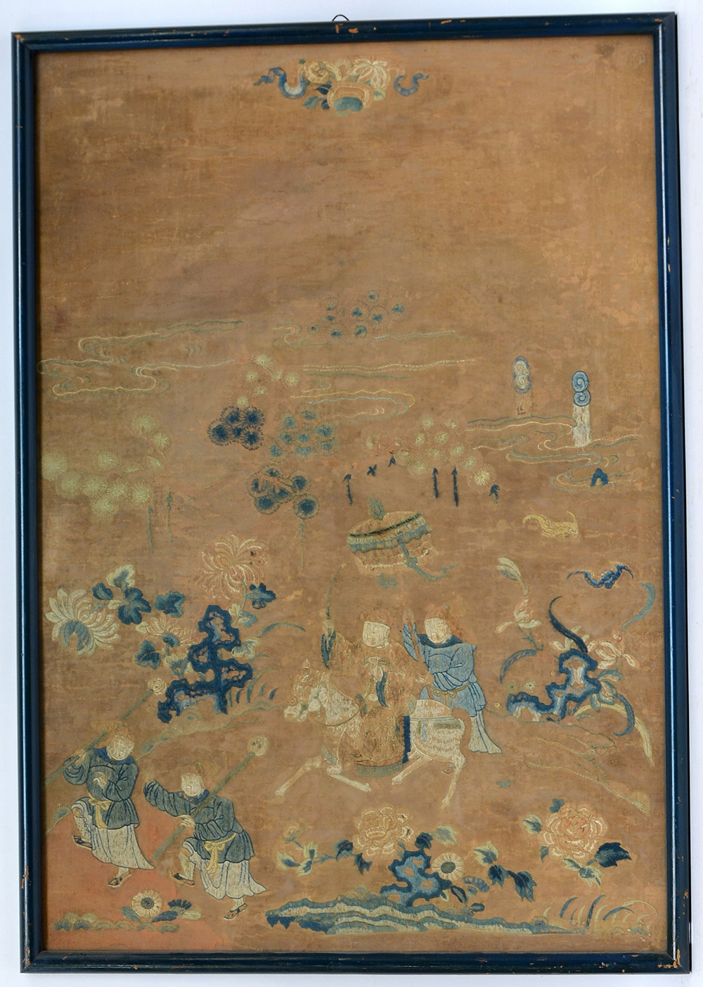 Antico ricamo cinese raffigurante un dignitario a cavallo con servitori in un paesaggio fiorito (cm 71x49), in cornice (difetti)