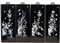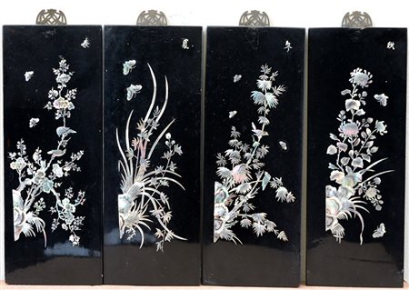 Lotto di quattro pannelli decorativi in legno laccato nero con intarsi in madreperla raffigurante le quattro stagioni, sostegno in metallo a forma di pipistrello stilizzato (lievi difetti) Cina, sec. XX (15x39,5 cm.)